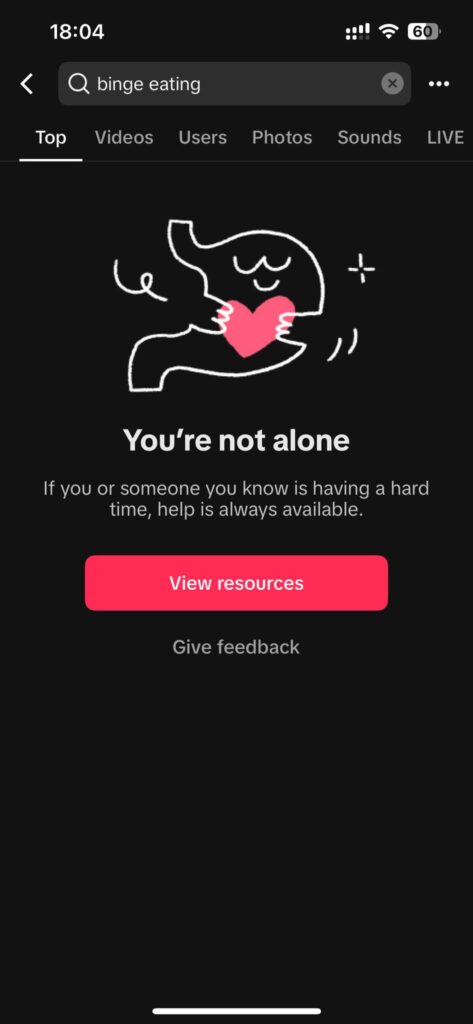Atunci când cauți cuvintele „binge-eating” pe TikTok, platforma nu îți va oferi videoclipuri despre acest subiect, ci îți va oferi câteva site-uri educative pe acest subiect și următorul mesaj: