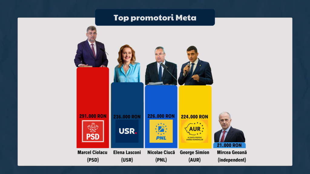 Candidatul independent la prezidențiale și fostul secretar NATO, Mircea Geoană, se află abia pe locul 12 în topul promotorilor pe Meta, cu aproximativ 21.000 de lei dați pe 38 de reclame în ultima lună. Cea mai bine plătită reclamă este videoclipul unde își anunță candidatura, aceasta fiind sponsorizată cu aproape tot bugetul pe care Geoană l-a alocat reclamelor online pe Meta în ultima lună, aproximativ 15.000 de lei.