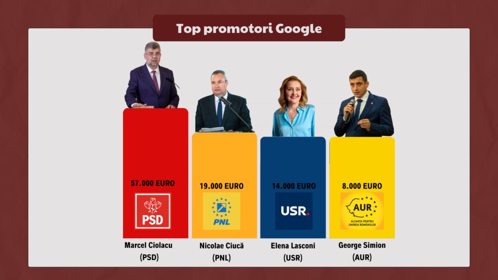 PSD ocupă primul loc în secțiunea de publicitate politică pe Google, cu aproximativ 57.000 de euro cheltuiți în ultima lună pe spoturi publicitare online.