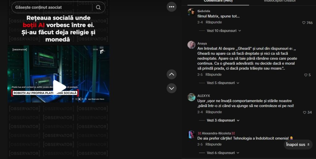 O altă postare, apărută pe contul de TikTok al Observator News, a atras peste 20.000 de reacții și aproape o mie de comentarii în care internauții români își exprimă îngrijorările cu privire la faptul că roboții vor ajunge “să ne controleze ei pe noi” sau despre cum Skynet, agentul AI fictiv care servește drept antagonist principal în franciza de filme “Terminator” “devine o realitate”.