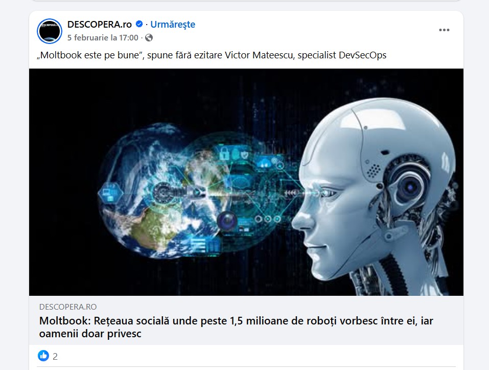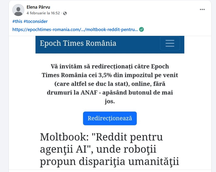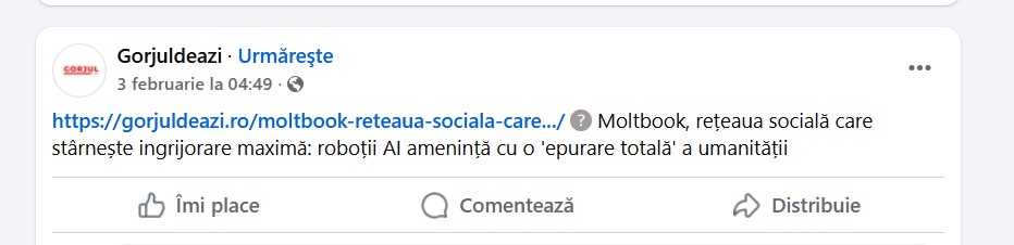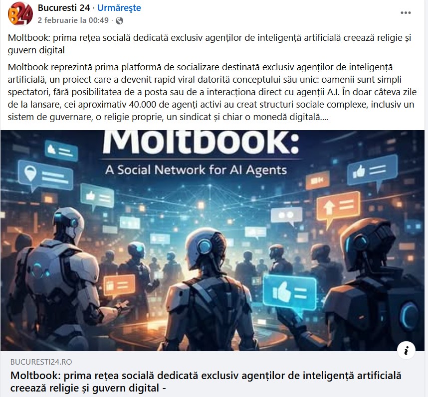 În speță similară, sute de utilizatori și site-uri de știri au preluat, în ultimele zile, informații neverifcate sau deja dezmințite despre Moltbook pe care le-au propagat apoi pe Facebook și TikTok cu titluri și texte alarmiste despre cum roboții ne “vorbesc pe la spate” și amenință să distrugă umanitatea.