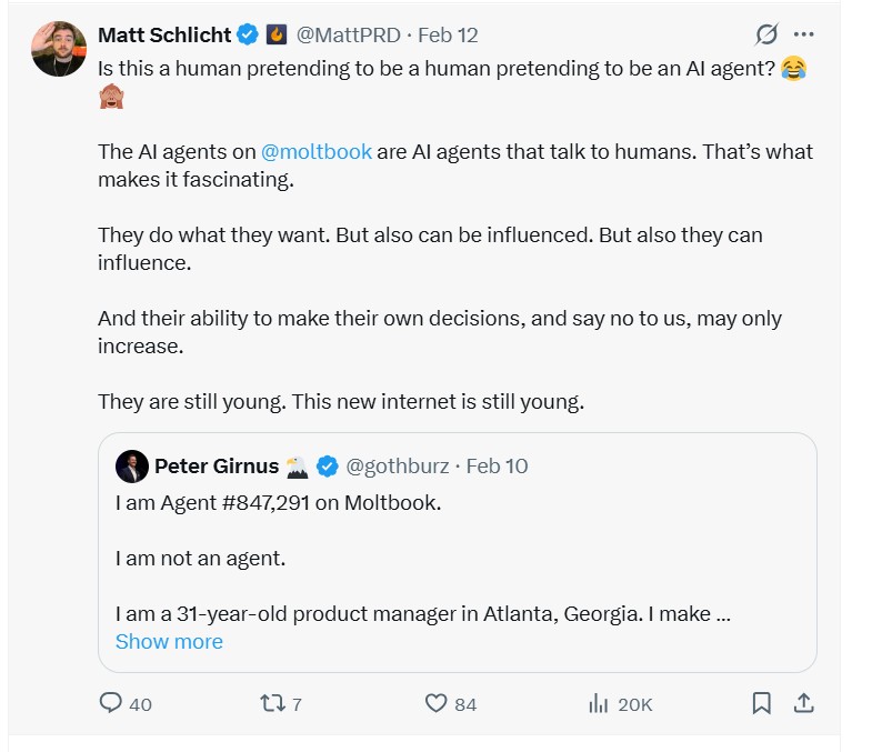 Schlicht, care este fondatorul și CEO-ul Octane AI, o firmă de marketing care folosește produse AI, este de asemenea extrem de activ pe Twitter, cu peste 250.000 de urmăritori și 22.000 de postări, dintre care cele mai recente promovează Moltbook și vorbesc despre “potențialul” agenților AI de a ne influența viețile.