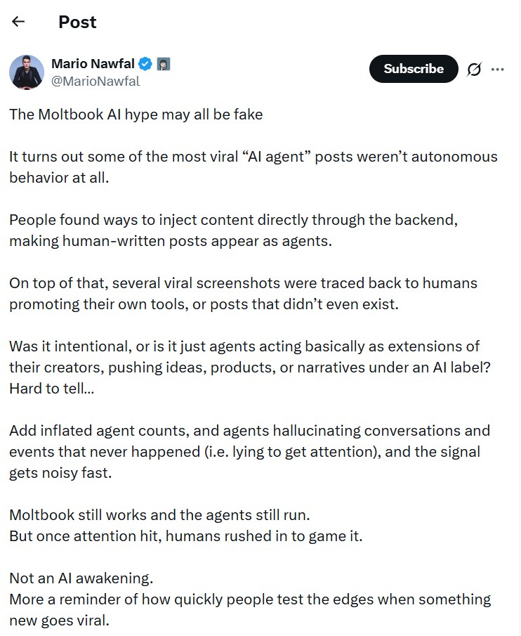Până și unii dintre susținătorii originali ai Moltbook au admis, după primele câteva zile, că hype-ul ar putea să fi fost falsificat. Inclusiv Mario Nawfaal s-a dezis de afirmațiile sale inițiale și și-a avertizat cei peste 3 milioane de urmăritori de pe Twitter că utilizatori umani au descoperit modalități de a se infiltra și a manipula conținutul postat pe Moltbook.