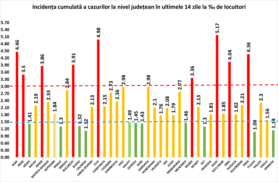 Coeficientul infectărilor cumulate la 14 zile, raportate la 1.000 de locuitori este calculat de către Direcțiile de Sănătate Publică, la nivelul Municipiului București și al județelor. Mai jos aveți graficul realizat în baza raportărilor primite de CNCCI de la Direcțiile de Sănătate Publică: