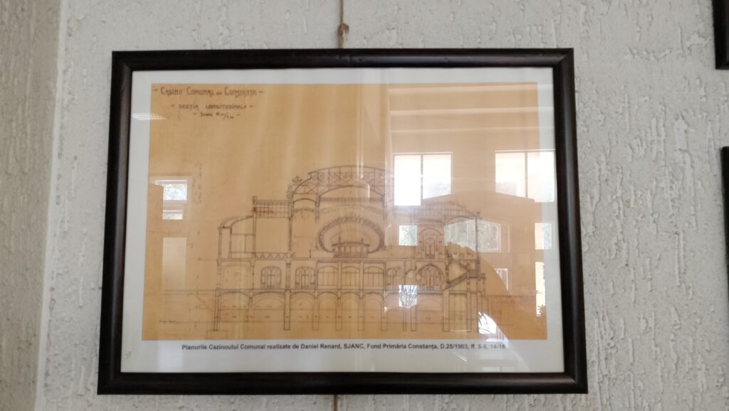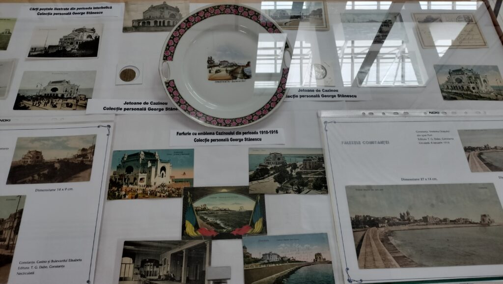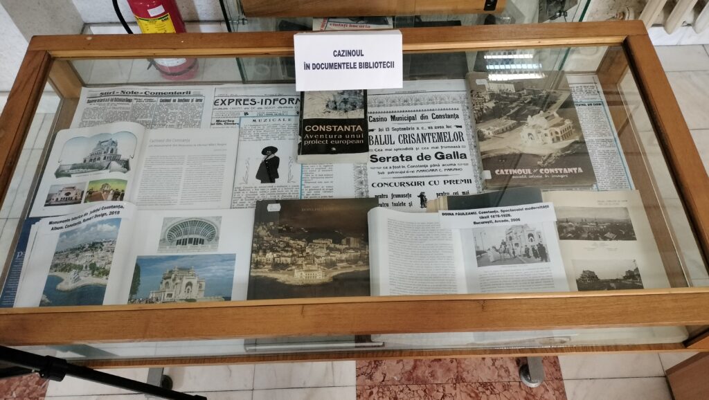Când intri în clădirea Bibliotecii Județene și urci scările spre foaierul instituției, în partea din stânga vei găsi una dintre cele două expoziții, organizată de Muzeul de Istorie Națională și Arheologie Constanța (MINAC), despre istoria Cazinoului din Constanța și deschisă publicului larg între 14 august – 30 septembrie. Printre documentele despre construirea monumentului, cărți poștale și lucrări tematice (volumul arhitectului Radu Cornescu sau monografia dedicată Cazinoului, scrisă de Doina Păuleanu), jetoanele cu care se juca la Cazino și articole din presa de la acea vreme, vei găsi și cele două bilețele scrise de deținuții politici care au lucrat la refacerea Cazinoului în anii ’50, descoperite în zidurile acestuia în anul 2020, respectiv 2023.