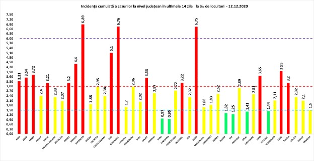 Coeficientul infectărilor cumulate la 14 zile, raportate la 1.000 de locuitori este calculat de către Direcțiile de Sănătate Publică, la nivelul Municipiului București și al județelor. Mai jos aveți graficul realizat în baza raportărilor primite de CNCCI de la Direcțiile de Sănătate Publică: