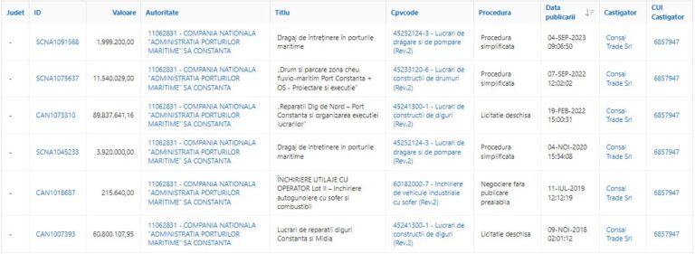 Consal Trade. Firma controlată de familia fraților Chicheanu din Constanța a obținut 6 contracte în valoare totală de 168 de milioane de lei (aproape 34 de milioane de euro) pentru dragaj, reparații la digul de nord, la diguri în Constanța și Midia și dragaj de întreținere în porturile maritime. Societatea a obținut contractele prin negociere fără publicare prealabilă, proceduri simplificate sau licitații deschise.
