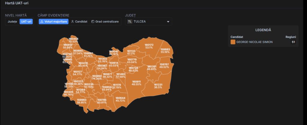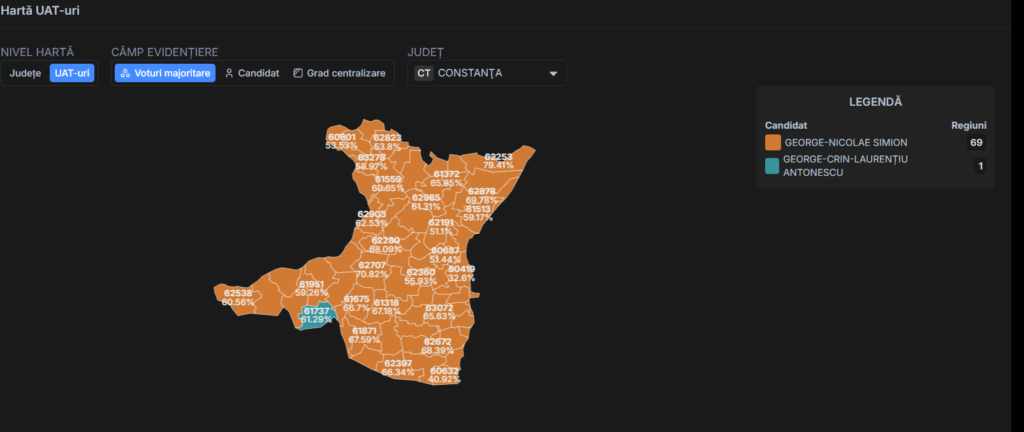 - Candidatul extremist a câștigat în cele 69 din 70 de localități din județul Constanța, în timp ce în Tulcea a bifat toate cele 51 de localități.