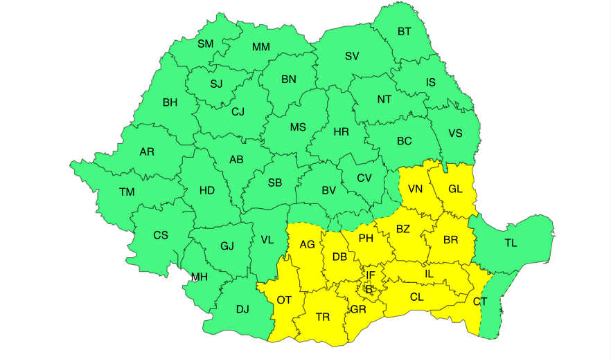 O altă atenționare intră în vigoare marți. „Marți, în sud-estul Olteniei, în sudul și în estul Munteniei, precum și în sud-vestul Dobrogei va fi caniculă și disconfort termic ridicat, iar indicele temperatură-umezeală (ITU) va atinge sau va depăși ușor pragul critic de 80 de unități. Temperaturile maxime vor fi de 35…37 de grade”, arată ANM.
