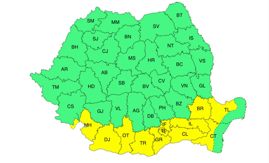 Meteorologii au emis luni o atenționare cod galben de caniculă și disconfort termic pentru vestul și în sudul Olteniei, sudul, centrul și estul Munteniei, precum și în Dobrogea continentală. „Temperaturile maxime vor fi de 35…38 de grade, iar cele minime de 18…21 de grade, astfel că vor caracteriza o noapte tropicală”, conform ANM.