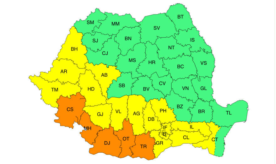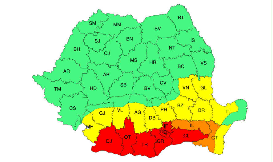 De asemenea, o parte din județul Constanța și Tulcea va fi sub cod galben de caniculă, începând de marți dimineață.