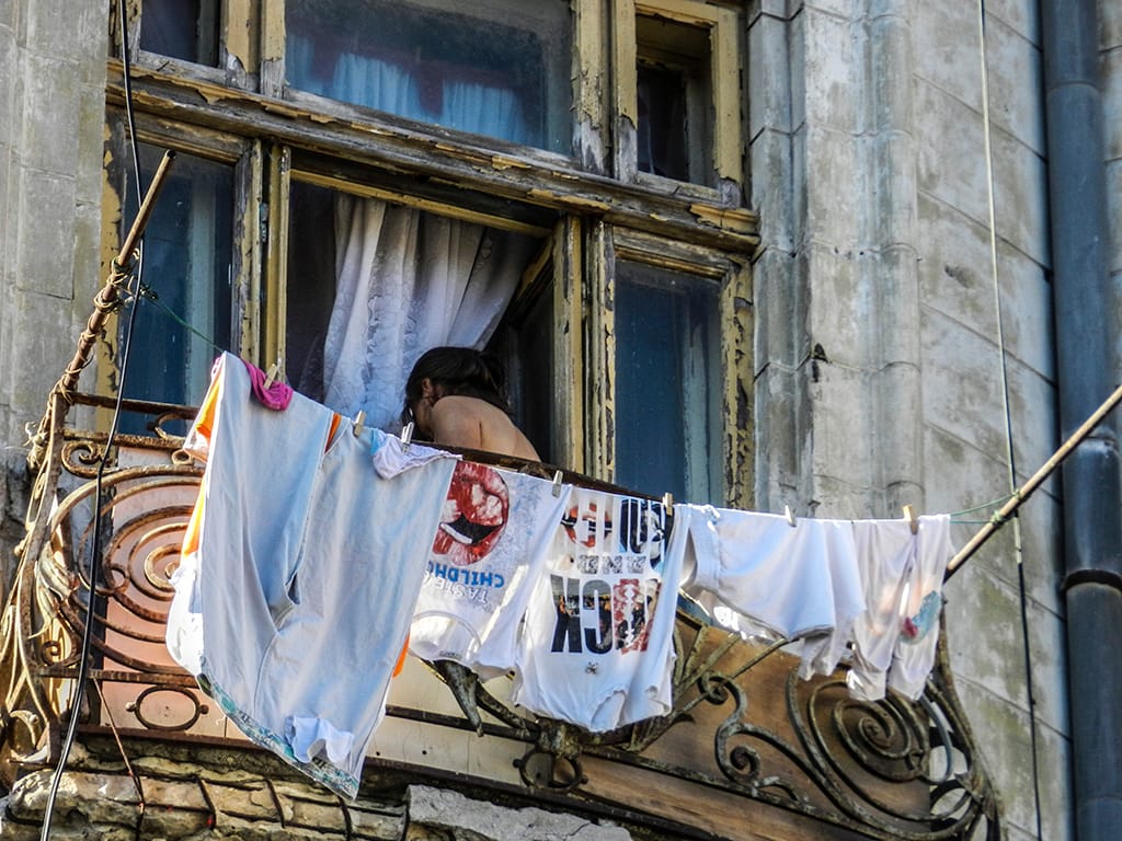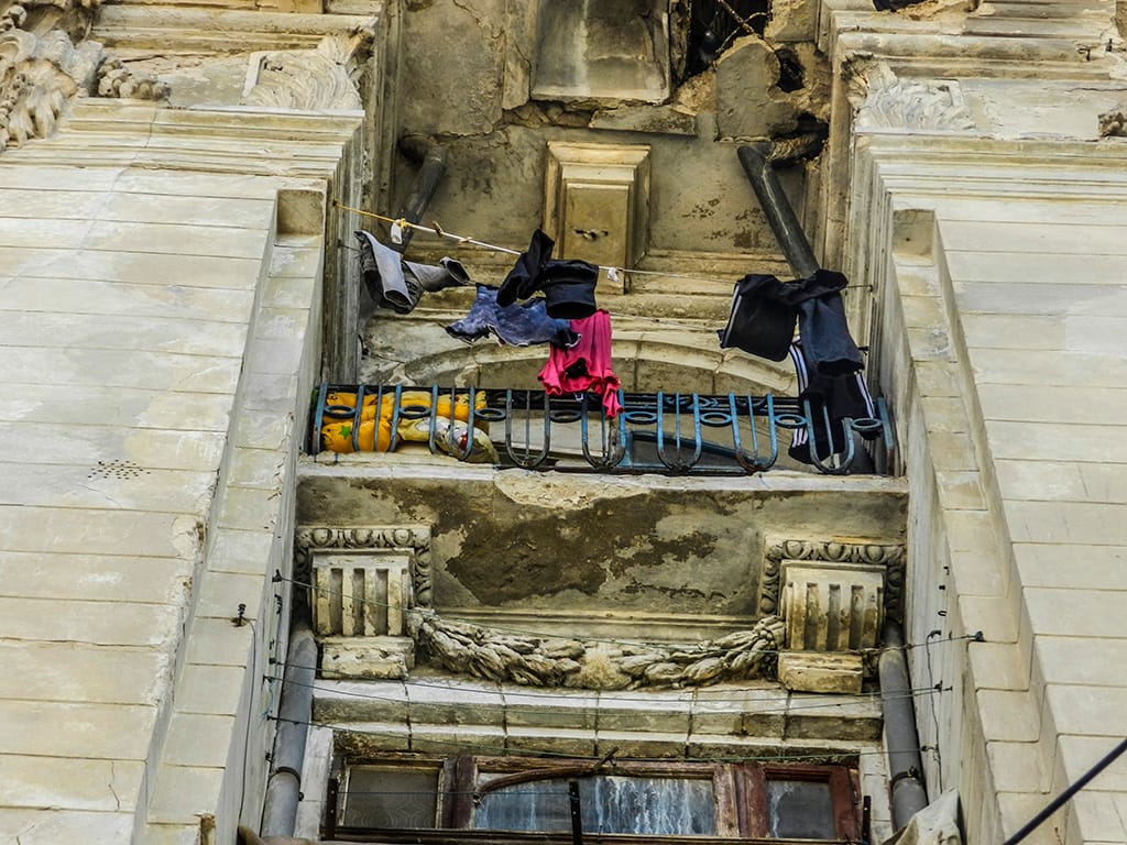 Rufe nu tocmai curate încă atârnă pe la balcoanele parțial dezintegrate, ușile de la intrarea în clădire au dispărut iar scările Casei Embiricos încă sunt urcate și coborâte de persoane în vârstă, bărbați, femei sau copii.