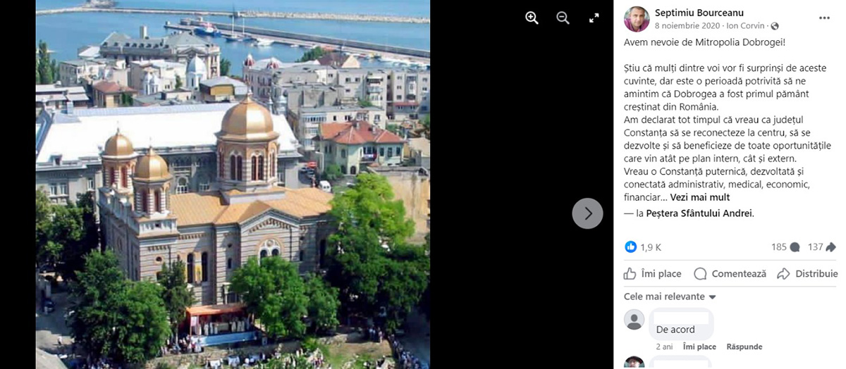 Chiar în prima zi din campania electorală pentru alegerile parlamentare din 2020, liberalul Septimiu Bourceanu a adus în discuție, într-o postare pe Facebook, ”creștinarea Dobrogei” și necesitatea ”reactivării Mitropoliei Tomisului” cu titlul de ”Mitropolia Dobrogei”.