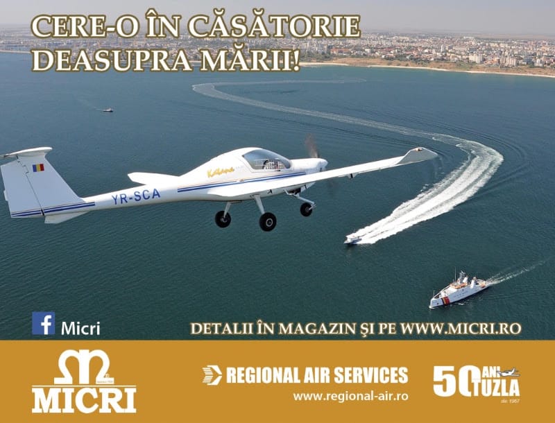Astfel, pentru orice inel de logodnă cu o valoare de peste 4800 de lei achiziţionat de la Casa de bijuterii Micri, viitorii miri beneficiază de un spectaculos zbor de agrement într-o aeronavă privată – Diamond 40, cu decolare de pe Aeroportul Alexandru Podgoreanu, Tuzla. Toate costurile legate de zbor sunt incluse în costul inelului.