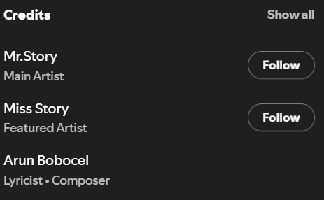 Pe platforma Spotify, în secțiunea de detalii a melodiilor, lângă ”Mr. Story”, care este listat ca artist principal, apar și autorul de versuri și compozitorul Arun Bobocel. Numele său figurează la toate piesele lansate de creatorul digital. Arun Bobocel este muzicant și are pe YouTube zeci de piese, majoritatea manele.