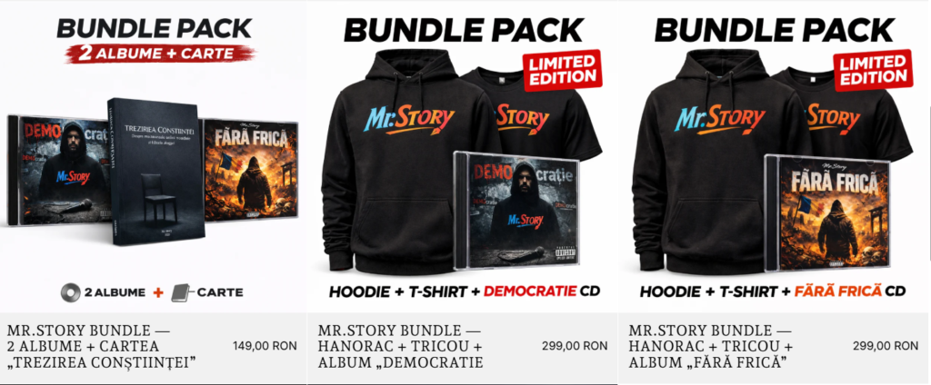 Cele mai noi produse de pe website sunt cele două albume muzicale ale lui ”Mr. Story”, ”DEMOcrație” și ”Fără frică”. Fiecare album fizic, care vine sub formă de CD, costă 50 de lei și fac parte dintr-o ediție limitată, conform magazinului online.