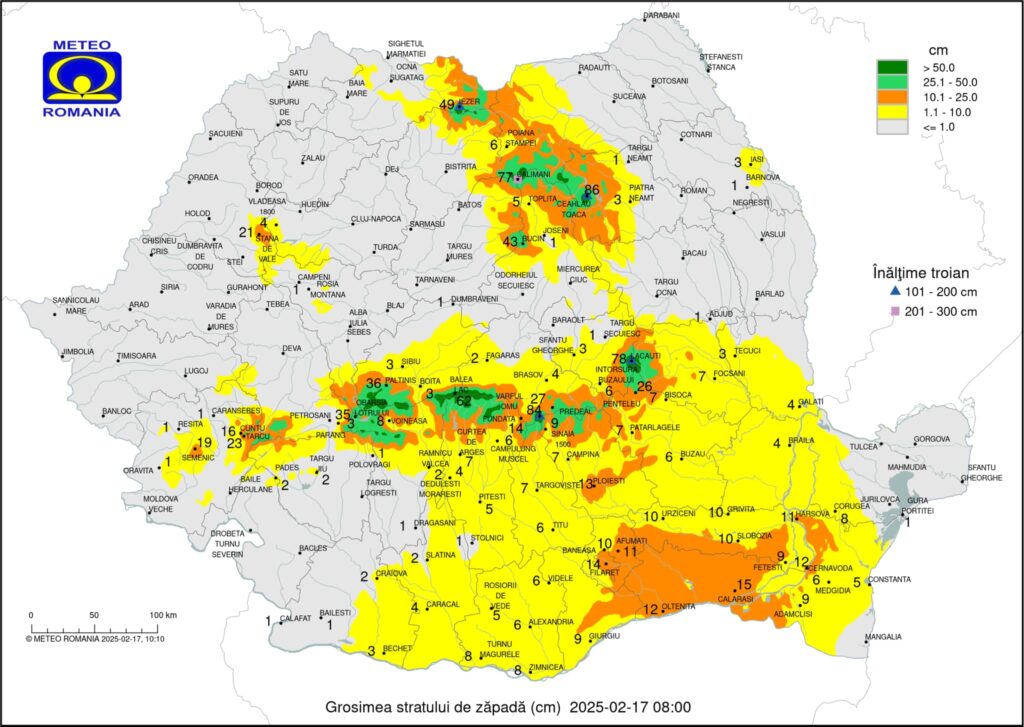 „În intervalul menționat în județele Ialomița, Călărași, Giurgiu, Teleorman, Ilfov și în municipiul București va ninge moderat cantitativ și se va depune strat nou de zăpadă, cu grosimi în general de 15…25 cm. În estul județului Olt, jumătatea sudică a județelor Argeș, Dâmbovița și Prahova și în vestul județului Constanța va ninge și se va depune strat nou de zăpadă, cu grosimi în general de 10…15 cm. Temporar vântul va avea intensificări cu viteze de până la 45 km/h, viscolind ninsoarea”, transmite Administrația Națională de Meteorologie.