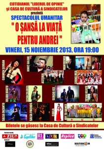 Printre cei impresionaţi de suferinţa lui Andrei, sunt şi o serie de artişti, şi nu doar din Constanţa, care ne invită pe toţi să fim alături de ei, pentru Andrei, la concertul umanitar din data de 15 noiembrie. Evenimentul, cu scop caritabil, va avea loc la Casa de Cultură a Sindicatelor din Constanţa, cu începere de la ora 19.00, iar preţul unui bilet este 25 lei. Biletele au fost puse în vânzare şi se pot procura de la Casa de Bilete a Casei de Cultură a Sindicatelor din Constanţa.