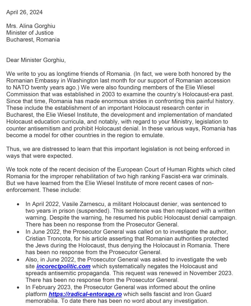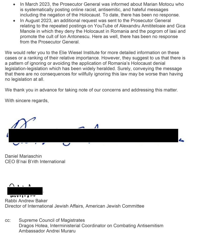 Dincolo de aceste exemple, într-o scrisoare transmisă Ministerului Justiției în 26 aprilie 2024 și intrată în posesia G4Media și Info Sud-Est, Daniel Mariaschin (CEO B’nai B’rith International) și rabinul Andrew Baker (director pentru Afaceri Evreiești Internaționale, în cadrul Comitetului Evreiesc American) acuză Parchetul General că nu a dat curs mai multor plângeri transmise de Institutul ”Elie Wiesel”. Mai jos, extrase din scrisoare: