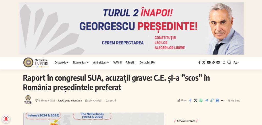Documentul a pătruns în spațiul online românesc cu titluri precum “Raport în congresul SUA, acuzații grave: Comisia Europeană și-a ”scos” în România președintele preferat” și “Internetul a sărit în aer: Raportul din SUA dovedește că președintele ales Călin Georgescu ”a fost eliminat fraudulos”, publicate de site-uri precum InPolitics.ro, OrtodoxInfo.ro și ActiveNews, sancționate în trecut pentru disimularea de informații false și cunoscute drept portavoci mediatice ale curentului extremist pro-rus din România,
