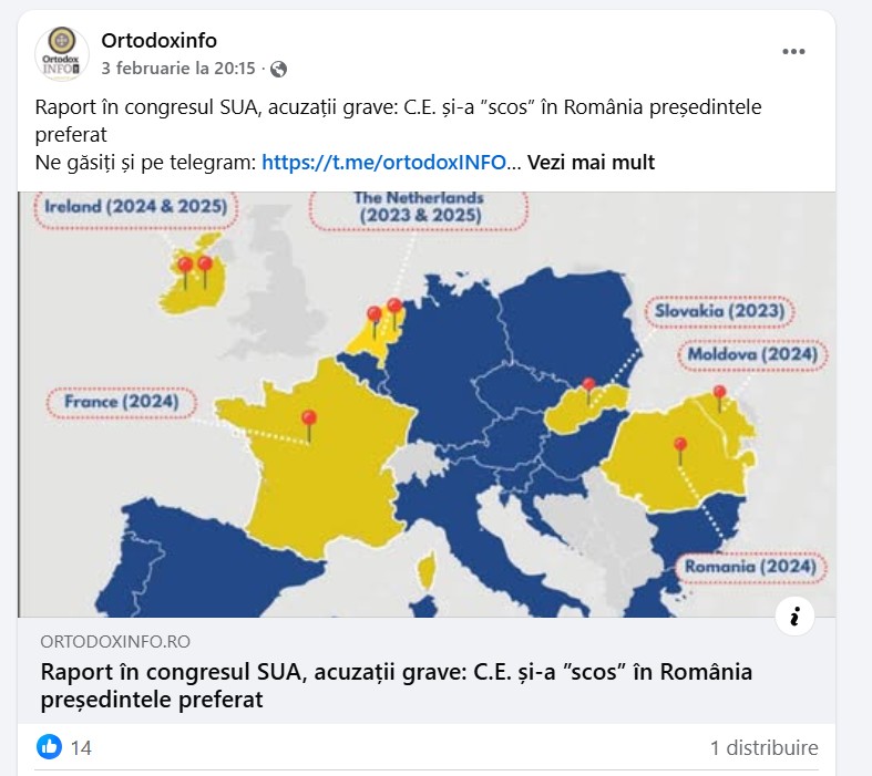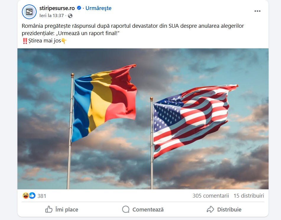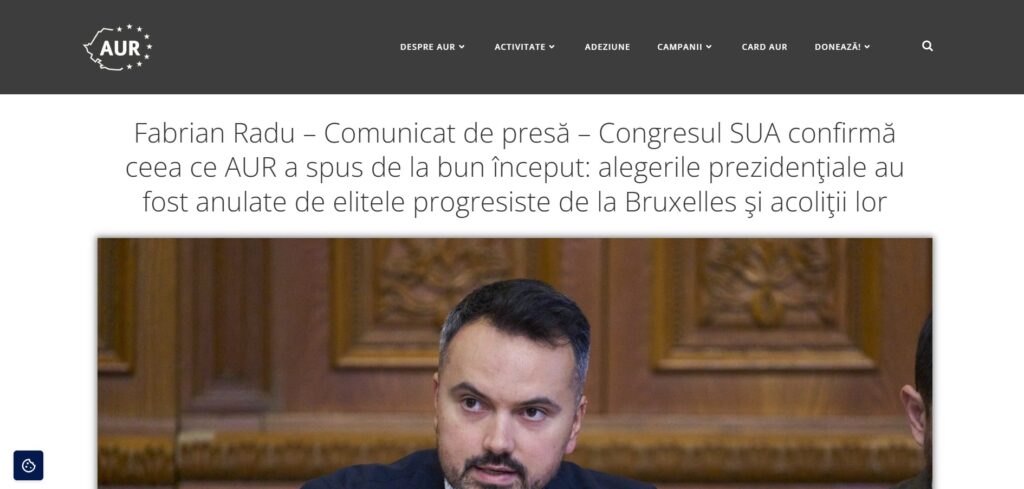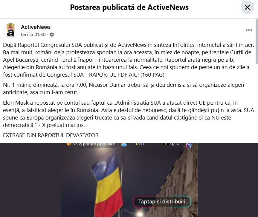 În ultimele câteva zile, “suveraniștii” de pe rețelele de socializare, încurajați de George Simion, șeful partidului extremist AUR, cer ca România să se supună concluziilor inexistente sau exagerate dintr-un raport preliminar publicat de o comisie dominată de republicanii din Congresul SUA și să organizeze alegeri parlamentare și prezidențiale anticipate. Mesajul a fost introdus în România de site-uri de știri cunoscute pentru propagandă pro-rusă și viralizat în spațiul online de influenceri conspiraționiști precum BobbyD și susținători ai pro-rusului Călin Georgescu.