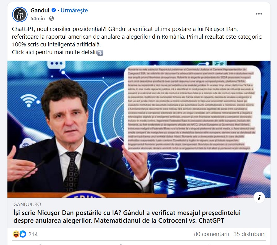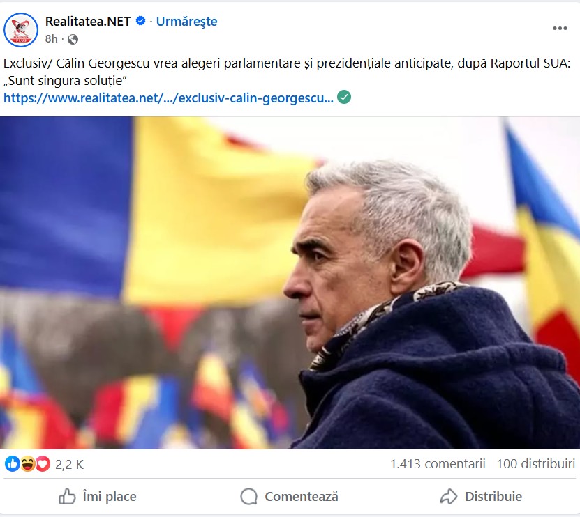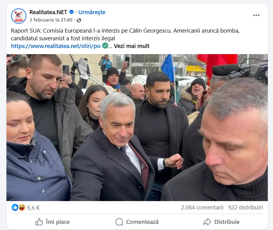 Unele dintre aceste articole au strâns zeci de mii de citiri în mai puțin de două zile, iar postări în care posturi precum Realitatea și ActiveNews acuzau Comisia Europeană că “l-a interzis pe Georgescu” și cereau “turul doi înapoi” au strâns mii de reacții și comentarii pe Facebook.