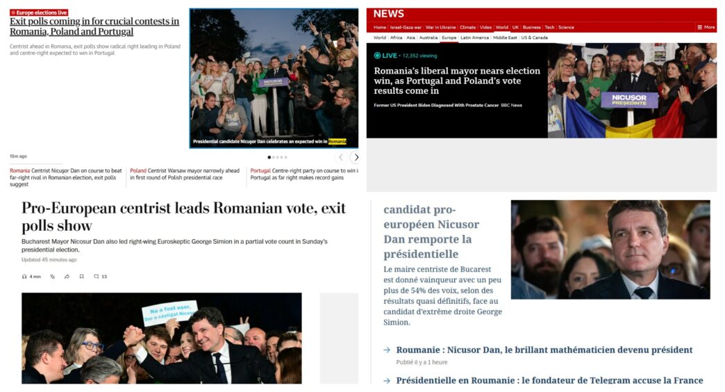 Jurnaliștii BBC l-au descris pe Nicușor Dan drept „primarul liberal al României” și au ținut să menționeze că performanța taberei pro-europene a fost mai puternică în România decât în celelalte două state care au luat parte a „Super Duminica” electorală a Europei. Este vorba despre Polonia, unde primul tur al alegerilor prezidențiale rămâne o cursă strânsă, și Portugalia, unde ascensiunea bruscă a extremismului de dreapta a șocat întregul sistem politic.