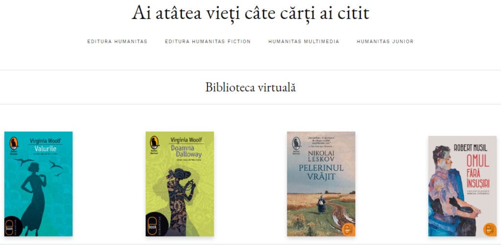 Editura Humanitas a anunțat că printre titlurile pe care le puteți găsi în biblioteca virtuală se numără „Omul fără însușiri“ de Robert Musil, „Scrisoare către tata“ de Franz Kafka, „Blândețea nopții“ de Scott Fitzgerald și multe altele.