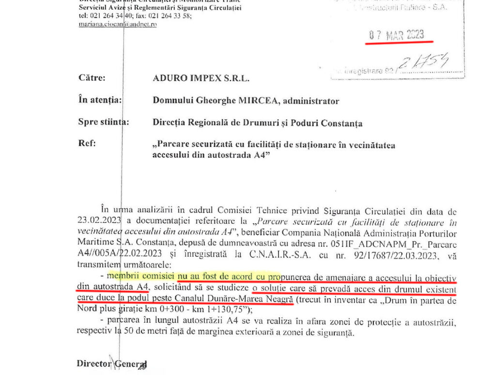 Inițial, în martie 2023, CNAIR transmite că accesul în viitoarea parcare de TIR-uri nu se poate face din Autostrada A4, așa cum ceruse compania portului în caietul de sarcini, și cere firmei să găsească o variantă de teren unde accesul să se facă din drumul care duce la podul peste Dunăre-Marea Neagră.