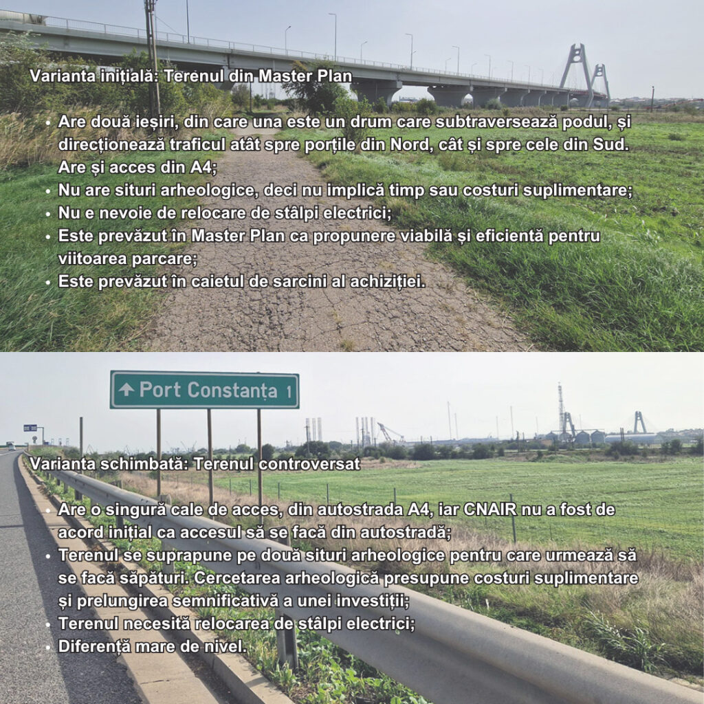 Motivul: Fosta conducere a Portului Constanța și CNAIR și-au schimbat, brusc și fără explicații, opțiunea pentru terenul pe care urma să fie amenajată parcarea și care era prevăzut în Master Planul Portului Constanța ca fiind viitorul loc al investiției. Au ales un teren vecin, cu mai multe dezavantaje, conform documentelor consultate.