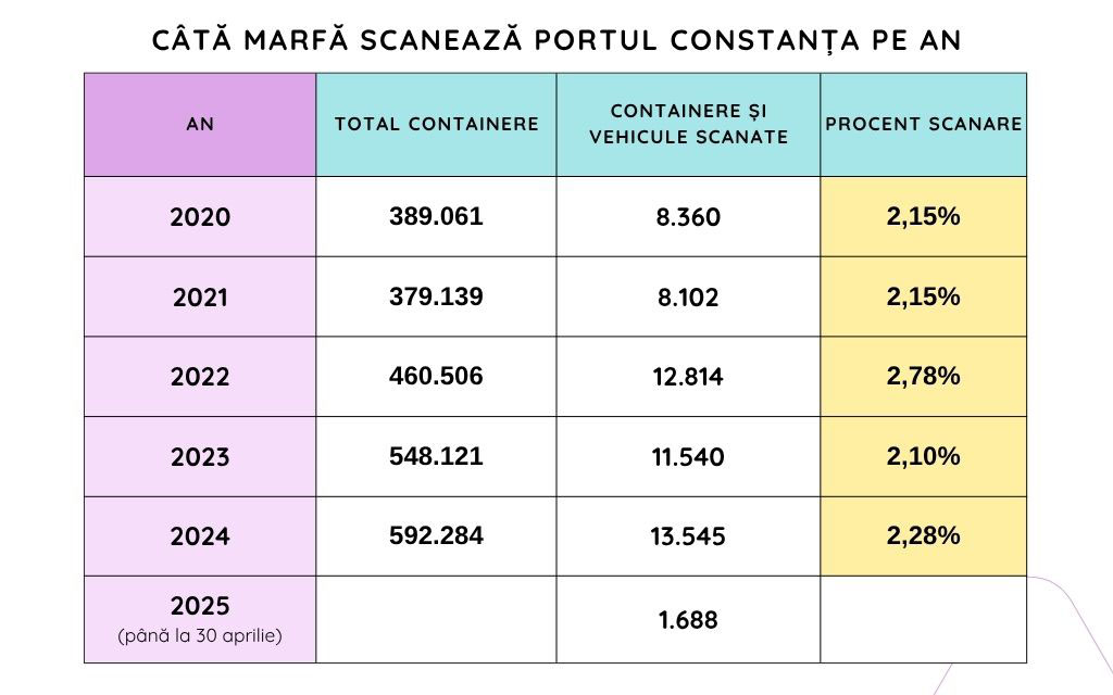 Am întrebat, de asemenea, câte scanere funcționează în Vama Constanța, care este capacitatea lor și câte containere au fost scanate din 2020 în prezent, defalcat pe fiecare an în parte.