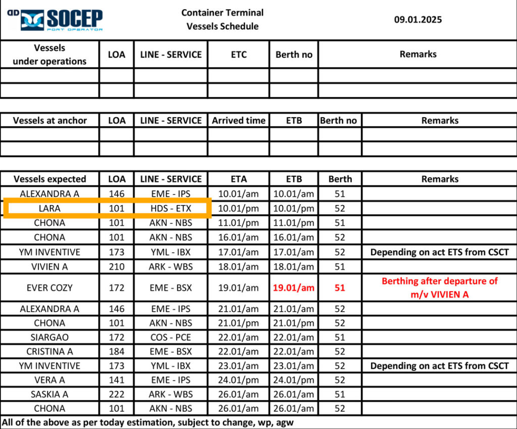 Nu în ultimul rând, conform orarului de intrare a navelor în terminalul SOCEP, din 9 ianuarie 2025, consultat de reporteri, în dreptul navei Lara figurează indicele aferent Hafiz Darya Arya Shipping Company (HDSL, HDASCO sau HDS Lines), o subsidiară a companiei naționale maritime iraniene IRISL, aflată de asemenea sub sancțiuni UE și SUA