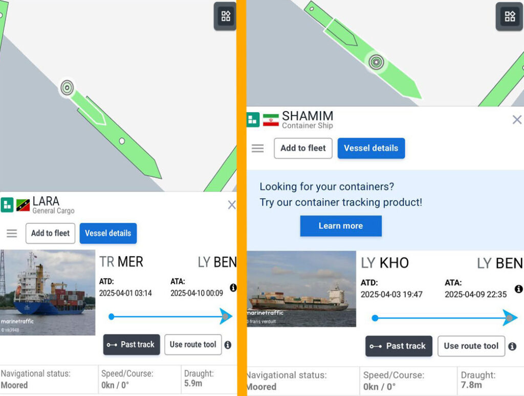 Navele Shamim (Iran) și Lara au ajuns aproape în același timp în portul libian Benghazi și au stat „lipite” în timpul staționării (Captură Marine Traffic)