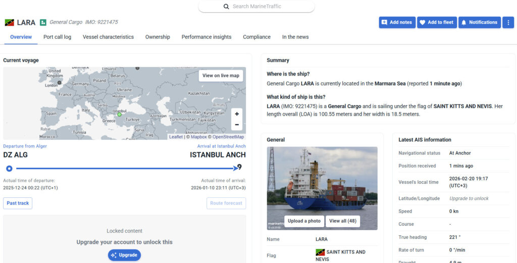 De-acolo, Lara urma să plece spre Portul Constanța, conform site-urilor de specialitate care urmăresc în timp real traseele navelor. Însă nava nu a mai părăsit portul din Istanbul, unde se află și în prezent, conform site-urile de trafic maritim.