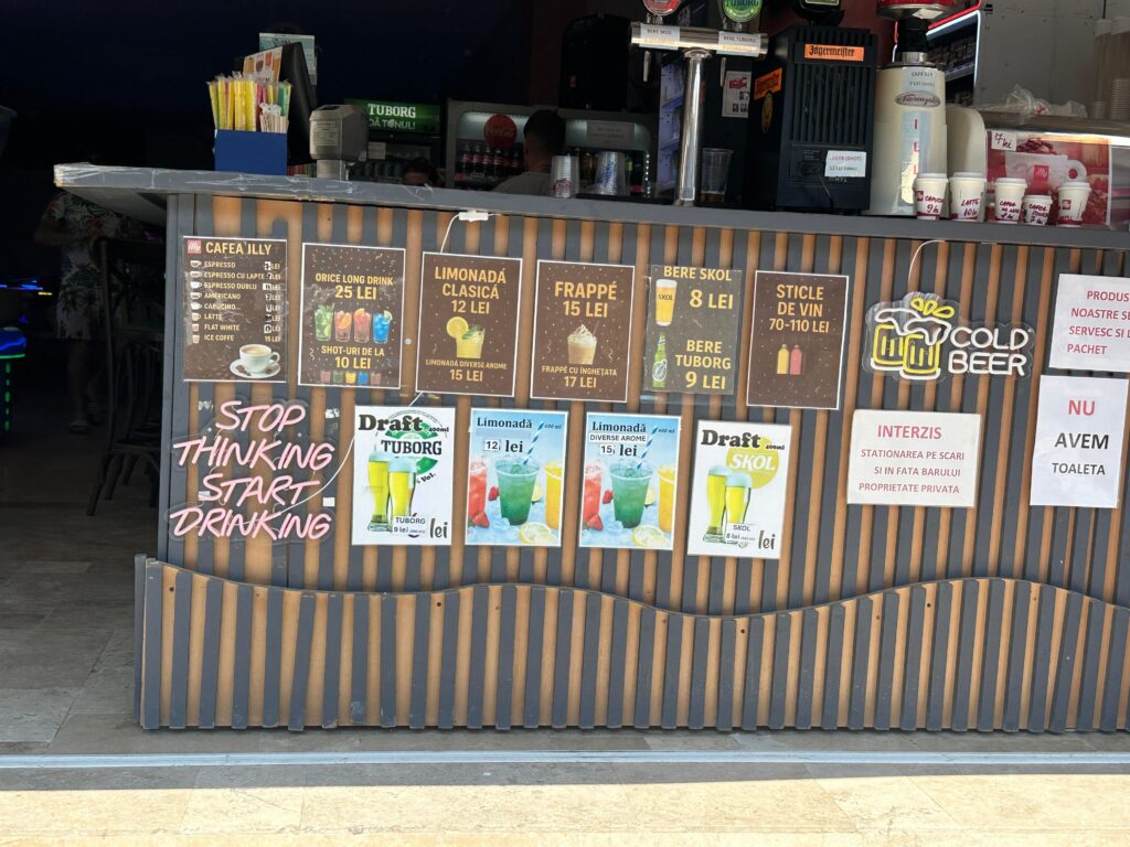 Pe faleză găsești locuri cu bere la draft la 7 lei, shoturi la 10 lei și meniul zilei la aproape 50 de lei, cu ciorbă, coaste de porc, cartofi prăjiți și salată de murături. Prețul unei cafele pornește de la 7 lei și ajunge și la 20 de lei, iar o limonadă costă aproximativ 15 lei. Per total, Costinești rămâne cea mai aglomerată stațiune, un loc în care manelele răsună și în miezul zilei, iar reclamele la pariuri și jocuri de noroc se găsesc la orice pas.