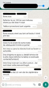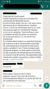 • „Dacă nu se poate da suma toată de odată puteți trimite și parțial. Am vrea ca până la sfârșitul lunii să facem și achizițiile. Dna dirigintă ne ajută cu detalii tehnice de la alte clase (referitor la tablă) și eventuale contacte (furnizori). Între timp încercăm să aflăm prețuri… dar sunt vorbe, neavând buget”.