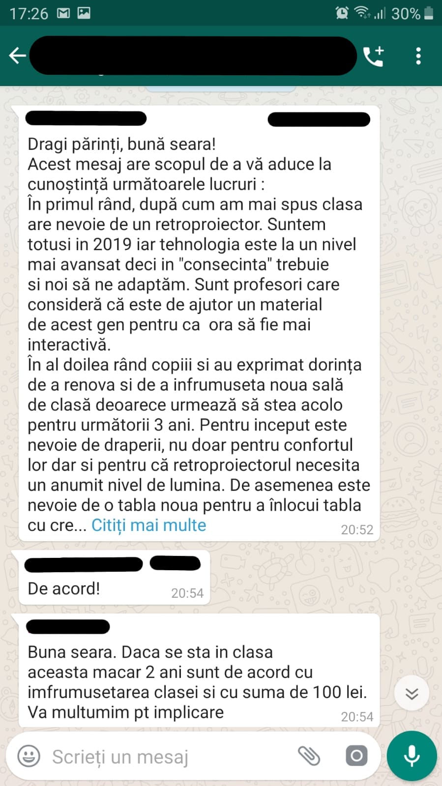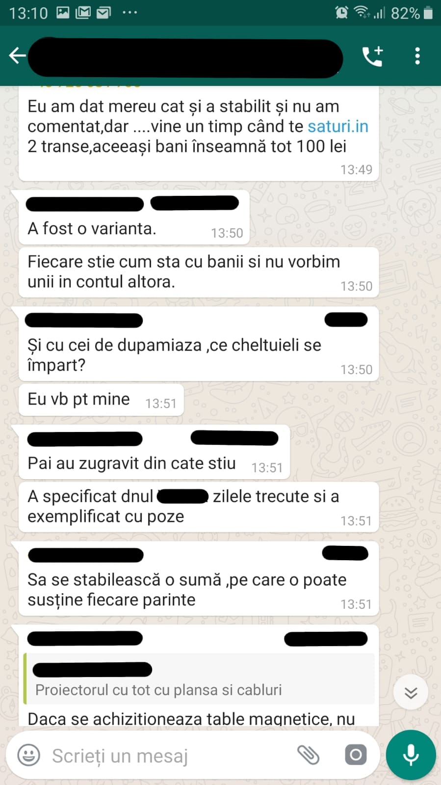 • „Referitor la cei 100 lei care trebuiau strânși, au dat doar 4 copii. Tabla și proiectorul sunt urgente”.