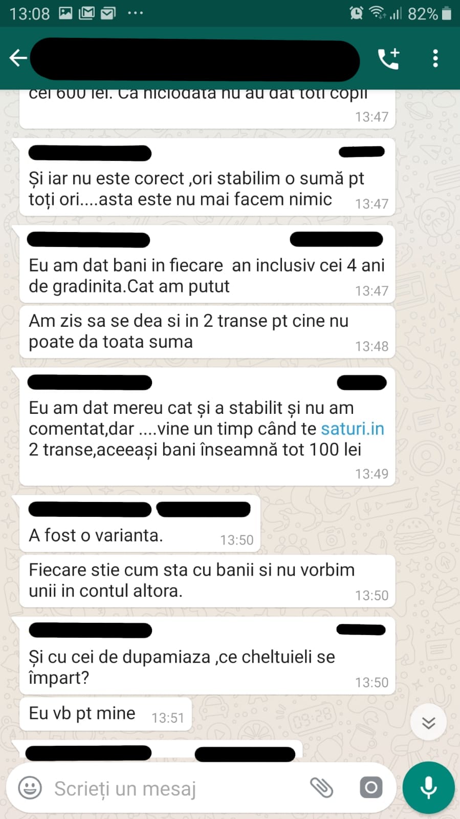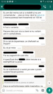 Un alt părinte povestește cum pe grupurile de Whatsapp ale clasei sunt incluși și diriginții care văd discuțiile dintre părinți, inclusiv momentele în care unii dintre aceștia se plâng de lipsa resurselor financiare, însă niciun profesor nu intervine în apărarea acestora sau nu oprește în vreun fel discuția despre bani: