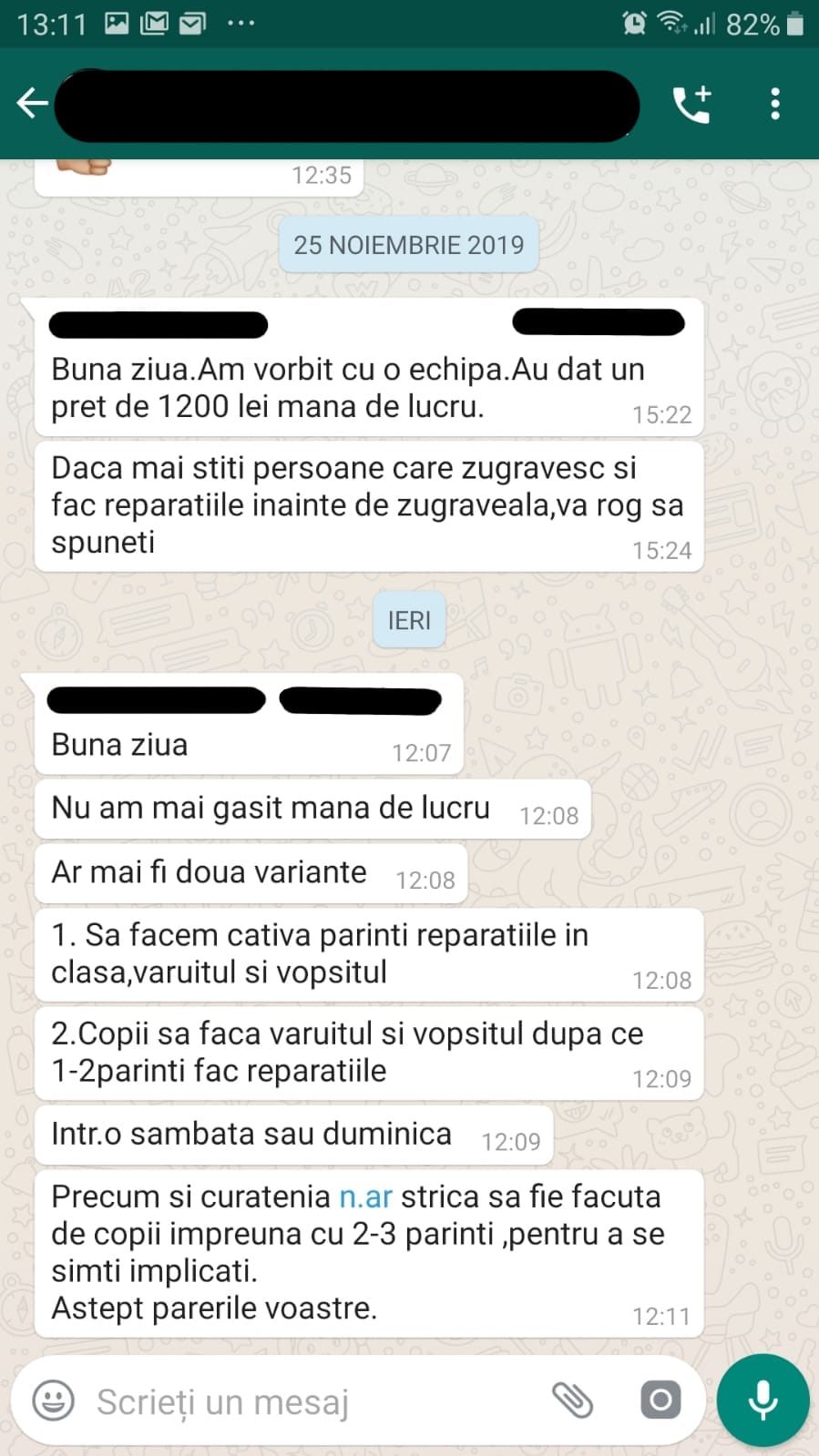 • „Bună ziua. Nu am mai găsit mână de lucru. Ar mai fi două variante: 1. Să facem câțiva părinți reparațiile în clasă, văruitul și vopsitul. 2. Copiii să facă văruitul și vopsitul după ce 1-2 părinți fac reparațiile. Într-o sâmbătă sau duminică. Precum și curățenia n-ar strica să fie făcută de copii împreună cu 2-3 părinți, pentru a se simți implicați. Aștept părerile voastre”.