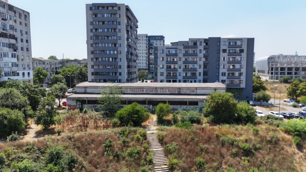 - De pe terenul de rugby, sufocat de buruieni înalte, se zărește sala de atletism abandonată.