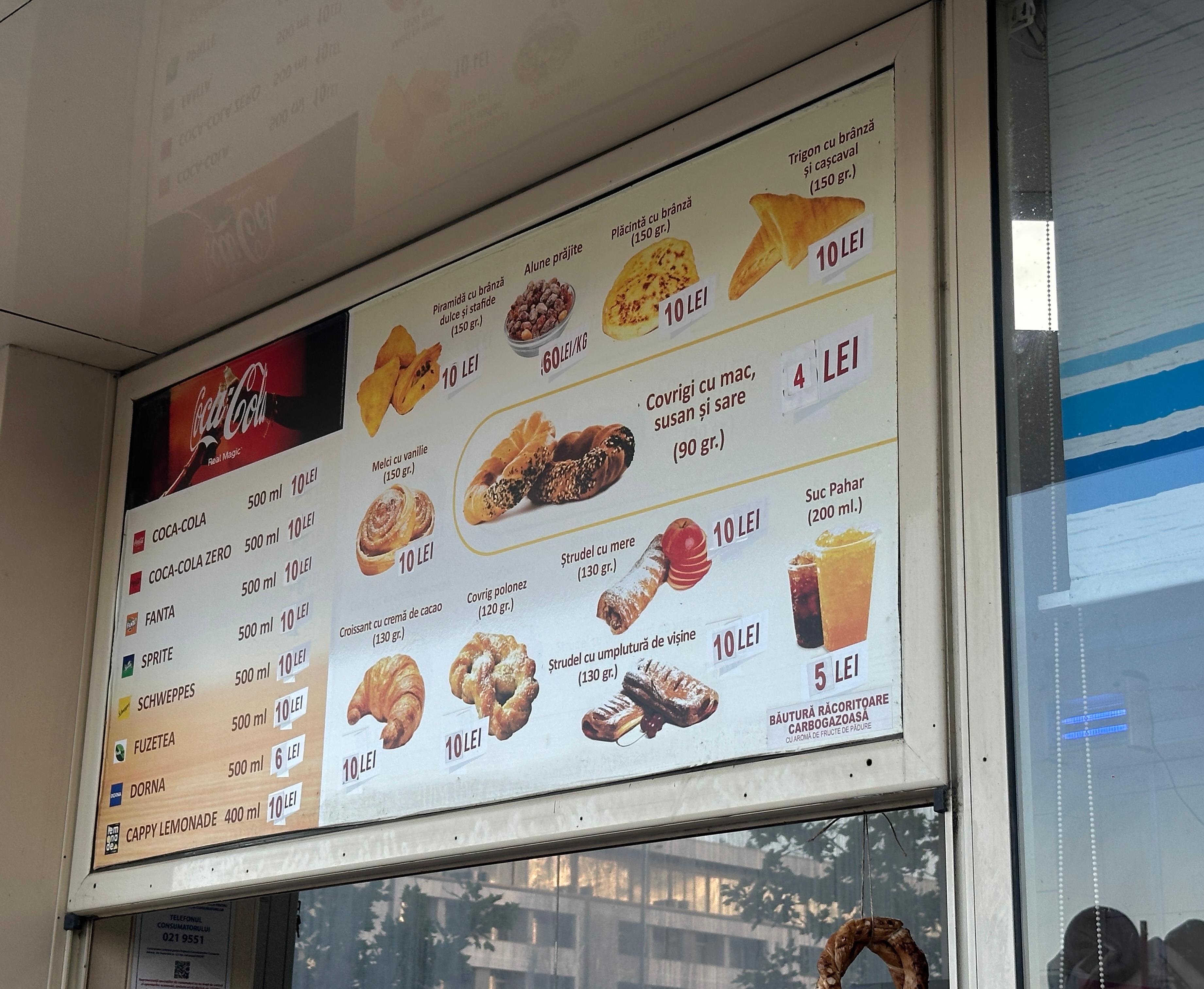 La o patiserie din zonă, un covrig cu mac / susan costa 4 lei. O plăcintă cu brânză, un corn cu ciocolată, ștrudel sau covrig polonez costau 10 lei, iar un suc la pahar, 5 lei. În aceeași zonă, un meniu cu shaorma mică de pui și suc ajunge la 30 de lei, iar un sombrero sau niște gogoși costă între 25 și 30 de lei.