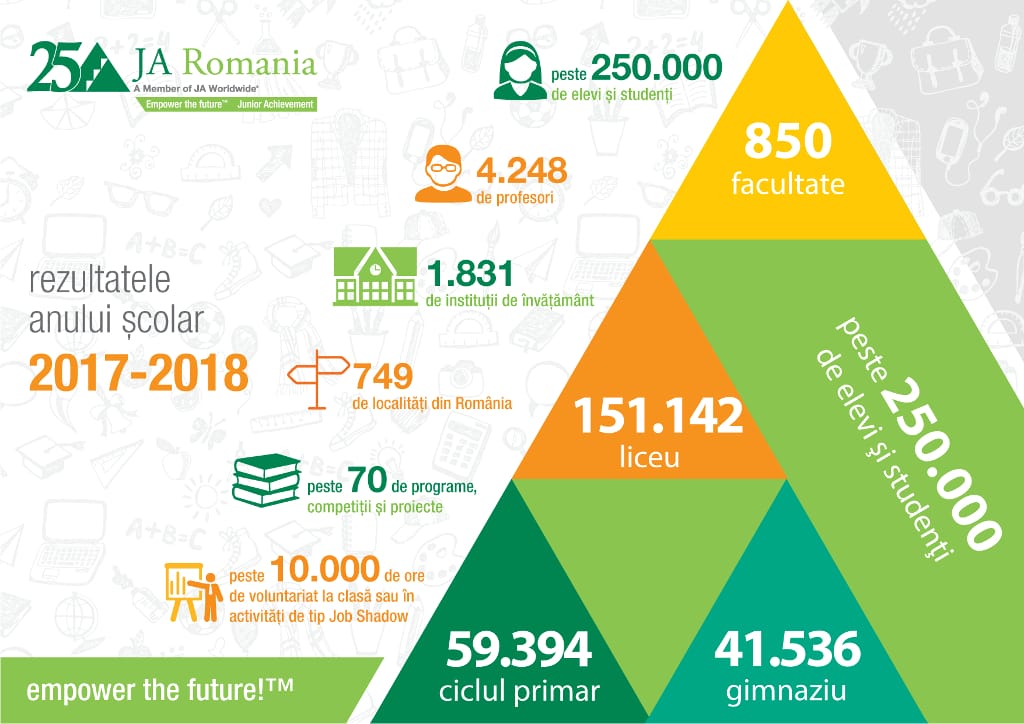 Profesori, elevi și studenți, profesioniști din comunitatea de afaceri și companii, pentru care educația este parte a drumului lor, au clădit, alături de consiliul director și de echipa organizației, ceea ce este Junior Achievement acum în România: cea mai mare organizație de educație, care, printr-un parteneriat public-privat, aduce anual peste 250.000 de tineri mai aproape de visul lor profesional.
