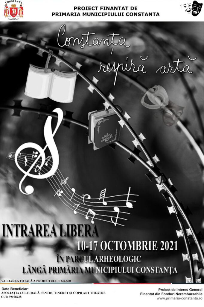 “Constanţa respiră artă” începe în data de 10 octombrie 2021, se va finaliza pe 17 octombrie 2021 şi este un proiect pilon al structurii culturale a oraşului, susţinând, timp de șase zile, o infrastructură artistică impresionantă, compusă din zeci de actori, muzicieni şi artişti-animatori, cu multiple evenimente ce vor însufleţi zona Parcului Arheologic de lângă Primăria Municipiului Constanţa.