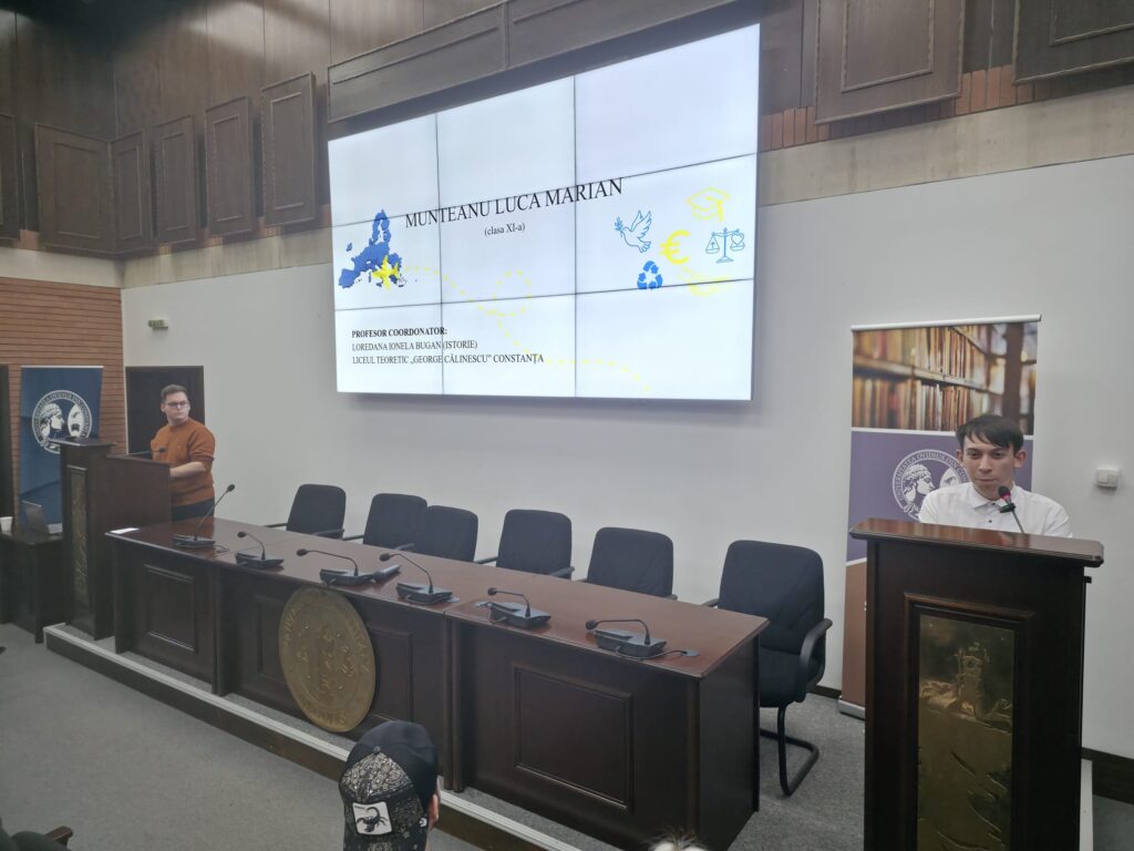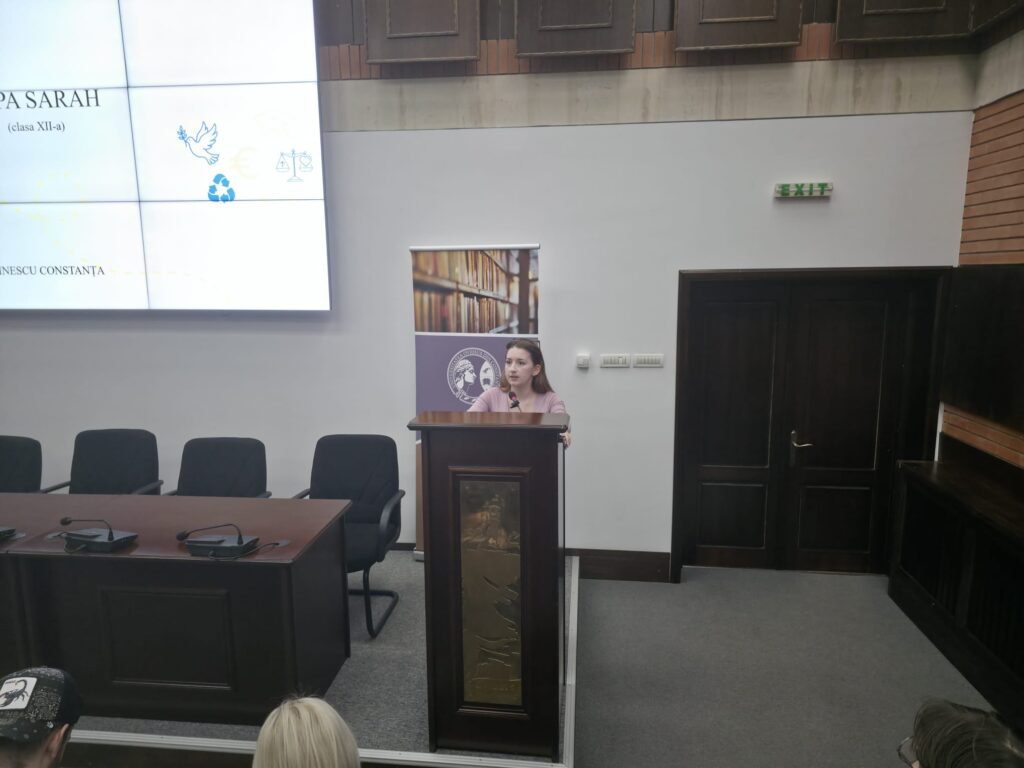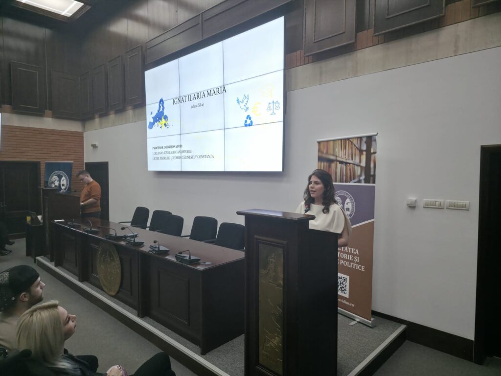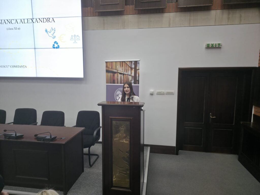 Bianca Alexandra Șchiopu, elevă în clasa a XI-a la Colegiul Național “Mihai Eminescu”, a vorbit în principal despre oportunitățile de dezvoltare personală și profesională de care se bucură în calitate de cetățean european.
