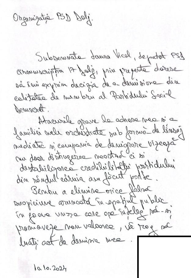 Laura Vicol a demisionat joi din PSD, potrivit documentului obținut în exclusivitate de G4Media. Ea a invocat în demisia transmisă la partid o presupusă ”campanie de denigrare” și un linșaj mediatic”, după cum arată documentul obținut de G4Media. Demisia vine la câteva zile după ce Nordis, firma soțului ei, a intrat în procedură de insolvență.