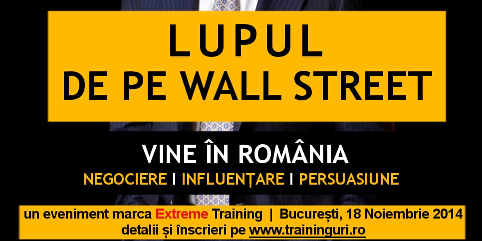 Jordan Belfort, personajul real interpretat de actorul Leonardo di Caprio în filmul nominalizat la Oscar, “Lupul de pe Wall Street”, vine pentru prima dată în România, în data de 18 noiembrie 2014, pentru a susține o mega-conferință, organizată de Extreme Training, în cadrul căreia va dezvălui secretele din spatele succesului său în afaceri, printr-un concept inovator pe care l-a numit “Straight Line Persuasion”.