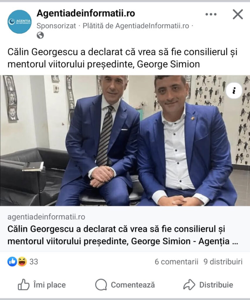 Mai multe pagini de Facebook ale unor site-uri fantomă propagă, cu puțin timp înainte de alegeri, mesajul că George Simion, candidatul partidului extremist AUR, e susținut de fostul ”premier” AUR, Călin Georgescu, care s-ar fi retras din cursă.