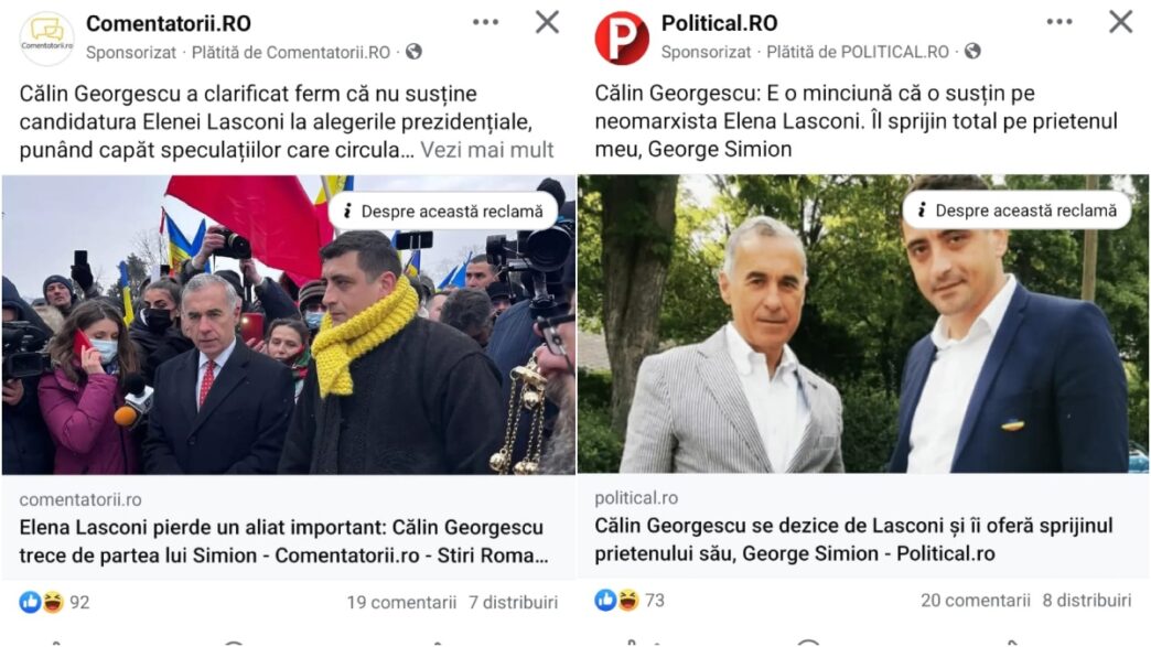 Site-urile fantomă identificate de ISE sunt comentatorii.ro, digipres.ro, political.ro, agentiadeinformatii.ro și sunt rostogolite pe bani (postări sponsorizate) înainte de alegerile de duminică, în formate aproape identice: ”Știrea” este ilustrată cu o poză în care apar George Simion și Călin Georgescu și anunță că Georgescu nu o mai susține pe Elena Lasconi, ci îi transferă susținerea lui George Simion.