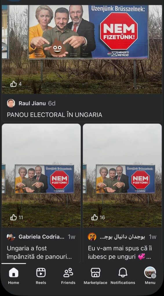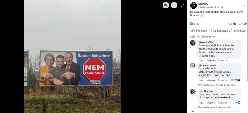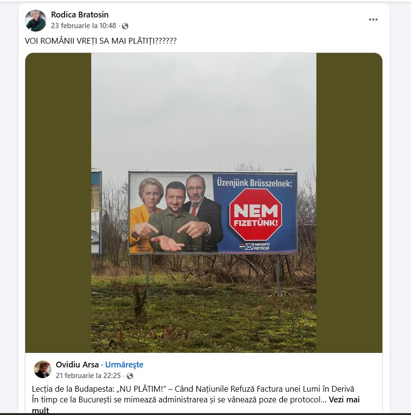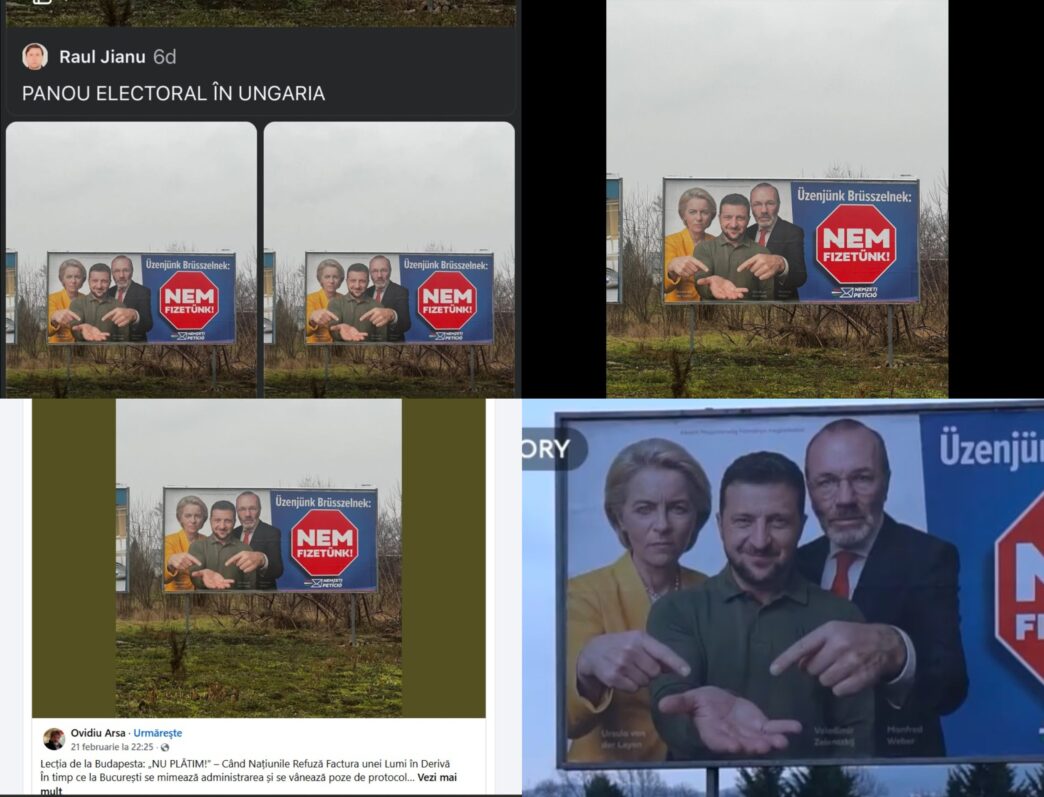 De câteva săptămâni, în spațiul online românesc au redevenit virale mai multe poze și imagini cu bannere electorale anti-ucrainene și anti-UE care împânzesc bulevardele Budapestei de câteva săptămâni. Internauții români, în mod deosebit influencerii “suveraniști”, au preluat la sfârșitul lui februarie și au popularizat din nou narațiunea guvernului ungar condus de Viktor Orbán, care cheltuiește sume considerabile din bani publici pentru a le spune cetățenilor săi că Budapesta “nu mai plătește” pentru Ucraina, care a devenit laitmotivul campaniei electorale disperate a partidului Fidesz condus de Orban.