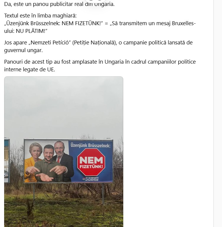 Pancartele care există de ceva vreme în Budapesta și tocmai au atras atenția “suveraniștilor români” conțin un mesaj tăios și trei personaje ușor de recunoscut: „Üzenjünk Brüsszelnek: NEM FIZETÜNK!” („Să-i transmitem Bruxelles-ului: NU PLĂTIM!”). Sloganul este scris, în general, pe un octagon roșu care aduce aminte de un semn de “STOP”, iar lângă el sunt prezentate colaje cu figurile Ursulei von der Leyen, șefa Comisiei Europene, a președintelui ucrainean Volodimir Zelenski și a lui Manfred Weber, liderul PPE, cel mai mare grup politic din Parlamentul European.